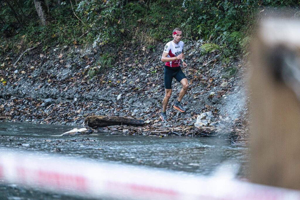 Pierwszy zbieg od długości 5 kilometrów i nachyleniu -20%. Stromo ale da się puścić nogi i zbieg staje się wtedy bardzo szybki – momentami po 3:00 – 3:20 min/km. Doganiam Włocha z 3 miejsca. Jednak mnie w połowie zbiegu dogania Luca Pescollderung (Mistrz Europy Spartana z zeszłego roku i obecny Mistrz Świata Spartan Ultra), który na szczycie miał do mnie kilkanaście sekund straty. Luca kończy zbieg ok. 20 sekund szybciej ode mnie, jednak nie chciałem za wszelką cenę trzymać jego tempa, bo widziałem, że mocno pracował na tym zbiegu. Doganiam go szybko na wypłaszczeniu i kontynuujemy wyścig dalej razem na 3 i 4 miejscu.