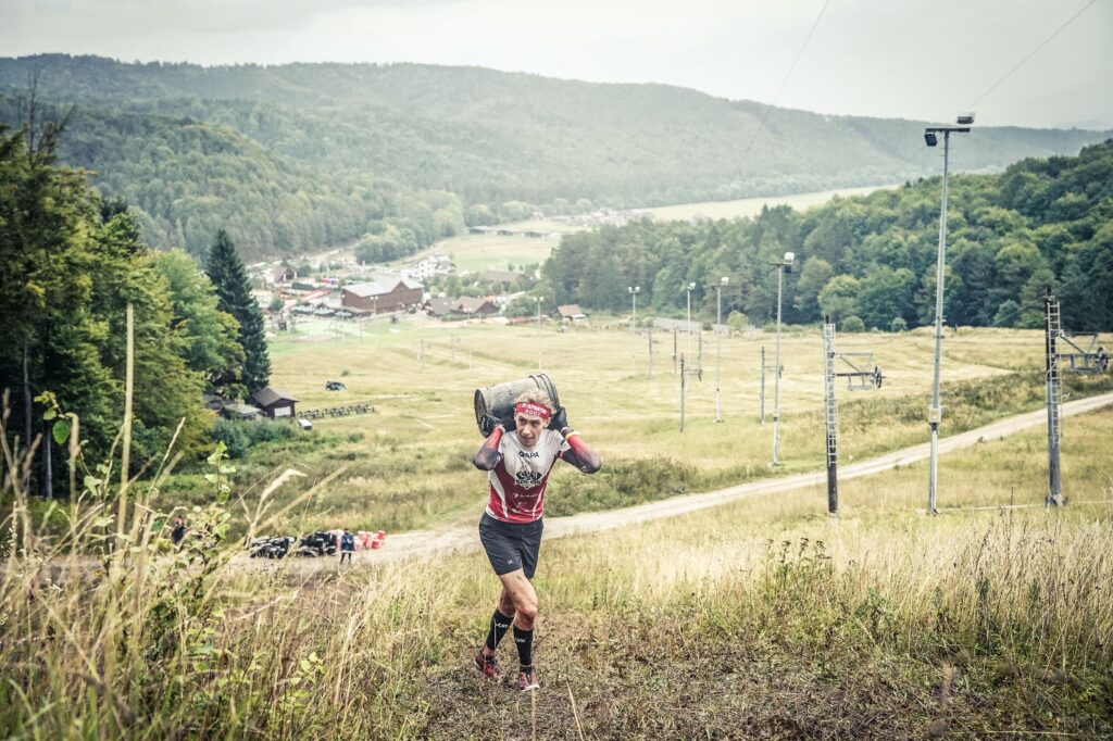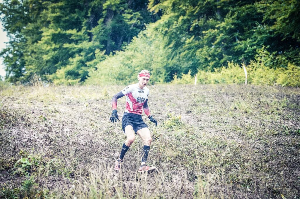 Pobiegliśmy trochę razem. Trochę ciężarów do przenoszenia i potem zaczął się dłuższy zbieg. Zazwyczaj jak są trudne zbiegi na trasie, to na nich zyskuje. Ale nie tym razem… Hrdina to kaskader, zbiegał po tym błocie naprawdę szybko i wrzucił mi około 100 metrów przewagi. Trzymałem mocne tempo, zyskiwałem sekundy na przeszkodach, aby się nie oddalił za mocno. Kluczowym momentem okazał się rzut włóczni. Mocny deszcz sprawił, że wszystko było mokre. Hrdina nie trafił, ja w tym momencie dobiegłem do przeszkody. Zdobyłem około 30 sekund przewagi, które on stracił na krótkiej rundzie karnej. Podkręciłem tempo biegu.